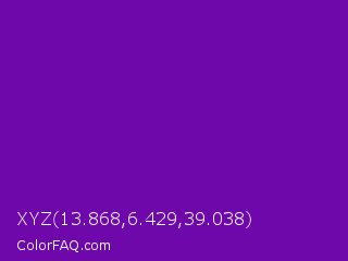 XYZ 13.868,6.429,39.038 Color is a normal purple color and the nearest color is Purple #660099. Hex code #6e08ab and RGB value is rgb(110,8,171). In RGB color space, this color is composed of 43% red, 3% green, 67% blue, In CMYK color space, this color is composed of 36% cyan, 95% magenta, 0% yellow , 33% black , In HSL color space, this color has a hue angle of 278° , 91% saturation and 35% lightness.