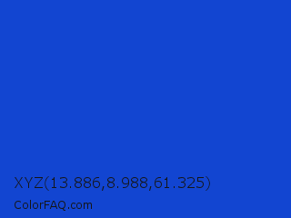 XYZ 13.886,8.988,61.325 Color is a normal blue color and the nearest color is New Car #214fc6. Hex code #1245d1 and RGB value is rgb(18,69,209). In RGB color space, this color is composed of 7% red, 27% green, 82% blue, In CMYK color space, this color is composed of 91% cyan, 67% magenta, 0% yellow , 18% black , In HSL color space, this color has a hue angle of 224° , 84% saturation and 45% lightness.