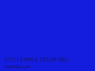 XYZ 13.889,6.253,69.582 Color is a normal blue color and the nearest color is Bluebonnet #1c1cf0. Hex code #141cde and RGB value is rgb(20,28,222). In RGB color space, this color is composed of 8% red, 11% green, 87% blue, In CMYK color space, this color is composed of 91% cyan, 87% magenta, 0% yellow , 13% black , In HSL color space, this color has a hue angle of 238° , 83% saturation and 47% lightness.