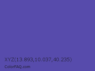XYZ 13.893,10.037,40.235 Color is a normal indigo color and the nearest color is Plump Purple #5946b2. Hex code #574bac and RGB value is rgb(87,75,172). In RGB color space, this color is composed of 34% red, 29% green, 67% blue, In CMYK color space, this color is composed of 49% cyan, 56% magenta, 0% yellow , 33% black , In HSL color space, this color has a hue angle of 247° , 39% saturation and 48% lightness.
