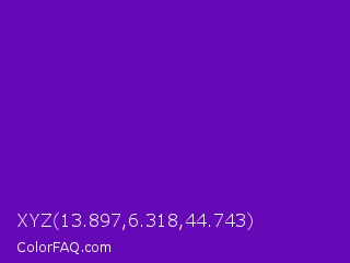 XYZ 13.897,6.318,44.743 Color is a normal purple color and the nearest color is Purple #660099. Hex code #6508b6 and RGB value is rgb(101,8,182). In RGB color space, this color is composed of 40% red, 3% green, 71% blue, In CMYK color space, this color is composed of 45% cyan, 96% magenta, 0% yellow , 29% black , In HSL color space, this color has a hue angle of 272° , 92% saturation and 37% lightness.