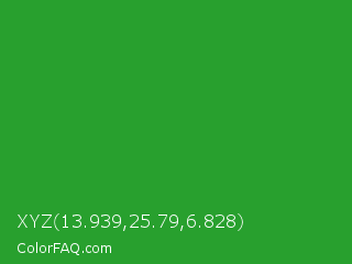 XYZ 13.939,25.79,6.828 Color is a normal green color and the nearest color is Wageningen Green #34b233. Hex code #28a02e and RGB value is rgb(40,160,46). In RGB color space, this color is composed of 16% red, 63% green, 18% blue, In CMYK color space, this color is composed of 75% cyan, 0% magenta, 71% yellow , 37% black , In HSL color space, this color has a hue angle of 123° , 60% saturation and 39% lightness.