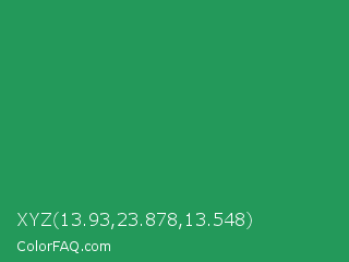 XYZ 13.93,23.878,13.548 Color is a normal green color and the nearest color is Eucalyptus #278a5b. Hex code #23995a and RGB value is rgb(35,153,90). In RGB color space, this color is composed of 14% red, 60% green, 35% blue, In CMYK color space, this color is composed of 77% cyan, 0% magenta, 41% yellow , 40% black , In HSL color space, this color has a hue angle of 148° , 63% saturation and 37% lightness.