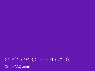 XYZ 13.943,6.733,43.213 Color is a normal violet color and the nearest color is Purple Heart Crayola #652dc1. Hex code #6618b3 and RGB value is rgb(102,24,179). In RGB color space, this color is composed of 40% red, 9% green, 70% blue, In CMYK color space, this color is composed of 43% cyan, 87% magenta, 0% yellow , 30% black , In HSL color space, this color has a hue angle of 270° , 76% saturation and 40% lightness.
