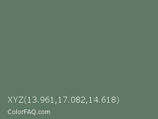 XYZ 13.961,17.082,14.618 Color is a normal green color and the nearest color is Willow Grove #65745d. Hex code #607964 and RGB value is rgb(96,121,100). In RGB color space, this color is composed of 38% red, 47% green, 39% blue, In CMYK color space, this color is composed of 21% cyan, 0% magenta, 17% yellow , 53% black , In HSL color space, this color has a hue angle of 130° , 12% saturation and 43% lightness.