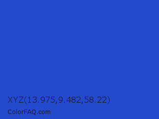 XYZ 13.975,9.482,58.22 Color is a normal blue color and the nearest color is New Car #214fc6. Hex code #2349cc and RGB value is rgb(35,73,204). In RGB color space, this color is composed of 14% red, 29% green, 80% blue, In CMYK color space, this color is composed of 83% cyan, 64% magenta, 0% yellow , 20% black , In HSL color space, this color has a hue angle of 227° , 71% saturation and 47% lightness.