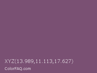 XYZ 13.989,11.113,17.627 Color is a normal magenta color and the nearest color is Twilight Lavender #8a496b. Hex code #7a5073 and RGB value is rgb(122,80,115). In RGB color space, this color is composed of 48% red, 31% green, 45% blue, In CMYK color space, this color is composed of 0% cyan, 34% magenta, 6% yellow , 52% black , In HSL color space, this color has a hue angle of 310° , 21% saturation and 40% lightness.