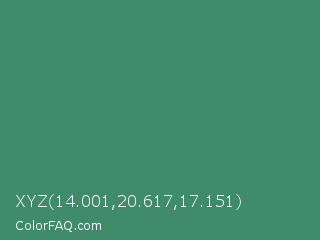 XYZ 14.001,20.617,17.151 Color is a normal green color and the nearest color is Viridian #40826d. Hex code #408b6b and RGB value is rgb(64,139,107). In RGB color space, this color is composed of 25% red, 55% green, 42% blue, In CMYK color space, this color is composed of 54% cyan, 0% magenta, 23% yellow , 45% black , In HSL color space, this color has a hue angle of 154° , 37% saturation and 40% lightness.