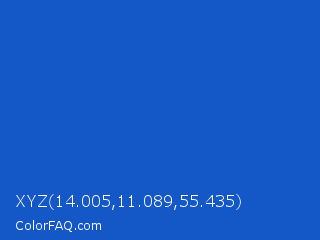 XYZ 14.005,11.089,55.435 Color is a normal blue color and the nearest color is Denim #1560bd. Hex code #1457c7 and RGB value is rgb(20,87,199). In RGB color space, this color is composed of 8% red, 34% green, 78% blue, In CMYK color space, this color is composed of 90% cyan, 56% magenta, 0% yellow , 22% black , In HSL color space, this color has a hue angle of 218° , 82% saturation and 43% lightness.
