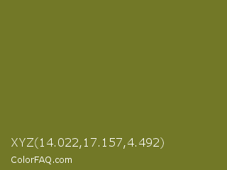 XYZ 14.022,17.157,4.492 Color is a normal yellow color and the nearest color is Crete #737829. Hex code #727827 and RGB value is rgb(114,120,39). In RGB color space, this color is composed of 45% red, 47% green, 15% blue, In CMYK color space, this color is composed of 5% cyan, 0% magenta, 68% yellow , 53% black , In HSL color space, this color has a hue angle of 64° , 51% saturation and 31% lightness.