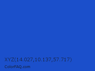 XYZ 14.027,10.137,57.717 Color is a normal blue color and the nearest color is New Car #214fc6. Hex code #1b4fcb and RGB value is rgb(27,79,203). In RGB color space, this color is composed of 11% red, 31% green, 80% blue, In CMYK color space, this color is composed of 87% cyan, 61% magenta, 0% yellow , 20% black , In HSL color space, this color has a hue angle of 222° , 77% saturation and 45% lightness.