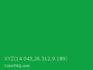 XYZ 14.043,26.312,9.189 Color is a normal green color and the nearest color is Green Pantone #00ad43. Hex code #0fa240 and RGB value is rgb(15,162,64). In RGB color space, this color is composed of 6% red, 64% green, 25% blue, In CMYK color space, this color is composed of 91% cyan, 0% magenta, 60% yellow , 36% black , In HSL color space, this color has a hue angle of 140° , 83% saturation and 35% lightness.