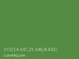 XYZ 14.047,21.046,8.632 Color is a normal green color and the nearest color is May Green #4c9141. Hex code #548c43 and RGB value is rgb(84,140,67). In RGB color space, this color is composed of 33% red, 55% green, 26% blue, In CMYK color space, this color is composed of 40% cyan, 0% magenta, 52% yellow , 45% black , In HSL color space, this color has a hue angle of 106° , 35% saturation and 41% lightness.