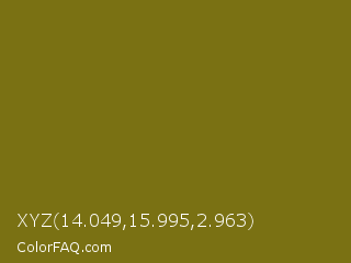 XYZ 14.049,15.995,2.963 Color is a dark yellow color and the nearest color is Olivetone #716e10. Hex code #7a7113 and RGB value is rgb(122,113,19). In RGB color space, this color is composed of 48% red, 44% green, 7% blue, In CMYK color space, this color is composed of 0% cyan, 7% magenta, 84% yellow , 52% black , In HSL color space, this color has a hue angle of 55° , 73% saturation and 28% lightness.