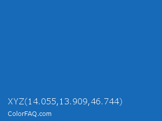 XYZ 14.055,13.909,46.744 Color is a normal blue color and the nearest color is Green Blue #1164b4. Hex code #176ab7 and RGB value is rgb(23,106,183). In RGB color space, this color is composed of 9% red, 42% green, 72% blue, In CMYK color space, this color is composed of 87% cyan, 42% magenta, 0% yellow , 28% black , In HSL color space, this color has a hue angle of 209° , 78% saturation and 40% lightness.