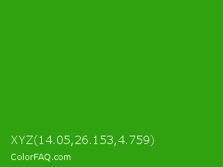 XYZ 14.05,26.153,4.759 Color is a normal green color and the nearest color is Slimy Green #299617. Hex code #30a10f and RGB value is rgb(48,161,15). In RGB color space, this color is composed of 19% red, 63% green, 6% blue, In CMYK color space, this color is composed of 70% cyan, 0% magenta, 91% yellow , 37% black , In HSL color space, this color has a hue angle of 106° , 83% saturation and 35% lightness.