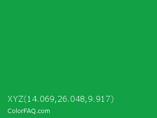 XYZ 14.069,26.048,9.917 Color is a normal green color and the nearest color is Green Pigment #00a550. Hex code #12a145 and RGB value is rgb(18,161,69). In RGB color space, this color is composed of 7% red, 63% green, 27% blue, In CMYK color space, this color is composed of 89% cyan, 0% magenta, 57% yellow , 37% black , In HSL color space, this color has a hue angle of 141° , 80% saturation and 35% lightness.