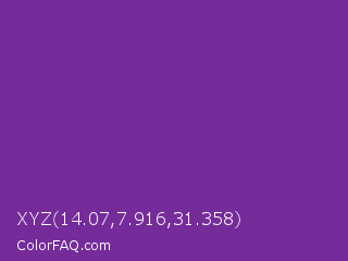 XYZ 14.07,7.916,31.358 Color is a normal purple color and the nearest color is Purple Heart #69359c. Hex code #752c9a and RGB value is rgb(117,44,154). In RGB color space, this color is composed of 46% red, 17% green, 60% blue, In CMYK color space, this color is composed of 24% cyan, 71% magenta, 0% yellow , 40% black , In HSL color space, this color has a hue angle of 280° , 56% saturation and 39% lightness.