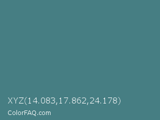 XYZ 14.083,17.862,24.178 Color is a normal cyan color and the nearest color is Bismark #497183. Hex code #467e83 and RGB value is rgb(70,126,131). In RGB color space, this color is composed of 27% red, 49% green, 51% blue, In CMYK color space, this color is composed of 47% cyan, 4% magenta, 0% yellow , 49% black , In HSL color space, this color has a hue angle of 185° , 30% saturation and 39% lightness.
