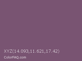 XYZ 14.093,11.621,17.42 Color is a normal magenta color and the nearest color is Falcon #7f626d. Hex code #795472 and RGB value is rgb(121,84,114). In RGB color space, this color is composed of 47% red, 33% green, 45% blue, In CMYK color space, this color is composed of 0% cyan, 31% magenta, 6% yellow , 53% black , In HSL color space, this color has a hue angle of 311° , 18% saturation and 40% lightness.