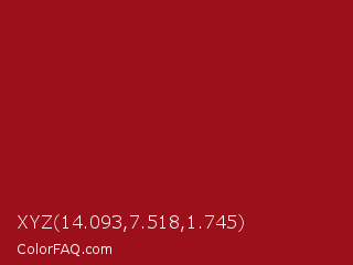 XYZ 14.093,7.518,1.745 Color is a normal red color and the nearest color is Ruby Red #9b111e. Hex code #9c101b and RGB value is rgb(156,16,27). In RGB color space, this color is composed of 61% red, 6% green, 11% blue, In CMYK color space, this color is composed of 0% cyan, 90% magenta, 83% yellow , 39% black , In HSL color space, this color has a hue angle of 355° , 81% saturation and 34% lightness.
