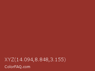 XYZ 14.094,8.848,3.155 Color is a normal red color and the nearest color is Vivid Auburn #922724. Hex code #96312a and RGB value is rgb(150,49,42). In RGB color space, this color is composed of 59% red, 19% green, 16% blue, In CMYK color space, this color is composed of 0% cyan, 67% magenta, 72% yellow , 41% black , In HSL color space, this color has a hue angle of 4° , 56% saturation and 38% lightness.