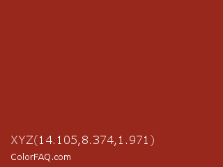 XYZ 14.105,8.374,1.971 Color is a normal red color and the nearest color is Vivid Auburn #922724. Hex code #99281c and RGB value is rgb(153,40,28). In RGB color space, this color is composed of 60% red, 16% green, 11% blue, In CMYK color space, this color is composed of 0% cyan, 74% magenta, 82% yellow , 40% black , In HSL color space, this color has a hue angle of 6° , 69% saturation and 35% lightness.