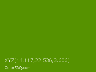 XYZ 14.117,22.536,3.606 Color is a dark green color and the nearest color is Avocado #568203. Hex code #569200 and RGB value is rgb(86,146,0). In RGB color space, this color is composed of 34% red, 57% green, 0% blue, In CMYK color space, this color is composed of 41% cyan, 0% magenta, 100% yellow , 43% black , In HSL color space, this color has a hue angle of 85° , 100% saturation and 29% lightness.