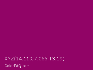 XYZ 14.119,7.066,13.19 Color is a dark magenta color and the nearest color is Fresh Eggplant #990066. Hex code #910466 and RGB value is rgb(145,4,102). In RGB color space, this color is composed of 57% red, 2% green, 40% blue, In CMYK color space, this color is composed of 0% cyan, 97% magenta, 30% yellow , 43% black , In HSL color space, this color has a hue angle of 318° , 95% saturation and 29% lightness.