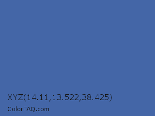 XYZ 14.11,13.522,38.425 Color is a normal blue color and the nearest color is San Marino #456cac. Hex code #4466a7 and RGB value is rgb(68,102,167). In RGB color space, this color is composed of 27% red, 40% green, 65% blue, In CMYK color space, this color is composed of 59% cyan, 39% magenta, 0% yellow , 35% black , In HSL color space, this color has a hue angle of 219° , 42% saturation and 46% lightness.