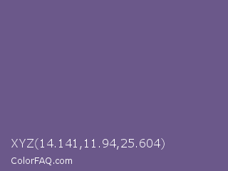 XYZ 14.141,11.94,25.604 Color is a normal violet color and the nearest color is Dark Lavender #734f96. Hex code #6b588a and RGB value is rgb(107,88,138). In RGB color space, this color is composed of 42% red, 35% green, 54% blue, In CMYK color space, this color is composed of 22% cyan, 36% magenta, 0% yellow , 46% black , In HSL color space, this color has a hue angle of 263° , 22% saturation and 44% lightness.
