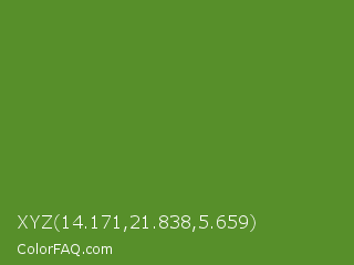XYZ 14.171,21.838,5.659 Color is a normal green color and the nearest color is Maximum Green #5e8c31. Hex code #578f2a and RGB value is rgb(87,143,42). In RGB color space, this color is composed of 34% red, 56% green, 16% blue, In CMYK color space, this color is composed of 39% cyan, 0% magenta, 71% yellow , 44% black , In HSL color space, this color has a hue angle of 93° , 55% saturation and 36% lightness.