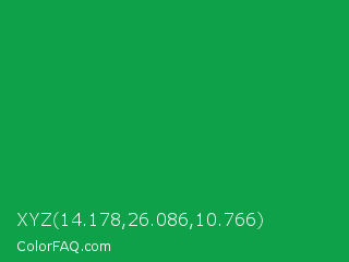 XYZ 14.178,26.086,10.766 Color is a normal green color and the nearest color is Green Pigment #00a550. Hex code #0fa14a and RGB value is rgb(15,161,74). In RGB color space, this color is composed of 6% red, 63% green, 29% blue, In CMYK color space, this color is composed of 91% cyan, 0% magenta, 54% yellow , 37% black , In HSL color space, this color has a hue angle of 144° , 83% saturation and 35% lightness.