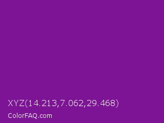 XYZ 14.213,7.062,29.468 Color is a normal purple color and the nearest color is Seance #731e8f. Hex code #7d1496 and RGB value is rgb(125,20,150). In RGB color space, this color is composed of 49% red, 8% green, 59% blue, In CMYK color space, this color is composed of 17% cyan, 87% magenta, 0% yellow , 41% black , In HSL color space, this color has a hue angle of 288° , 76% saturation and 33% lightness.