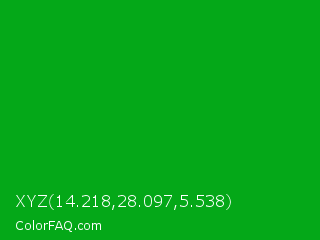 XYZ 14.218,28.097,5.538 Color is a normal green color and the nearest color is Islamic Green #009000. Hex code #04a818 and RGB value is rgb(4,168,24). In RGB color space, this color is composed of 2% red, 66% green, 9% blue, In CMYK color space, this color is composed of 98% cyan, 0% magenta, 86% yellow , 34% black , In HSL color space, this color has a hue angle of 127° , 95% saturation and 34% lightness.