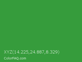 XYZ 14.225,24.887,8.329 Color is a normal green color and the nearest color is Wageningen Green #34b233. Hex code #369c3c and RGB value is rgb(54,156,60). In RGB color space, this color is composed of 21% red, 61% green, 24% blue, In CMYK color space, this color is composed of 65% cyan, 0% magenta, 62% yellow , 39% black , In HSL color space, this color has a hue angle of 124° , 49% saturation and 41% lightness.