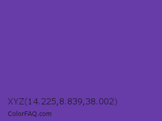 XYZ 14.225,8.839,38.002 Color is a normal violet color and the nearest color is Royal Purple #6b3fa0. Hex code #673ba8 and RGB value is rgb(103,59,168). In RGB color space, this color is composed of 40% red, 23% green, 66% blue, In CMYK color space, this color is composed of 39% cyan, 65% magenta, 0% yellow , 34% black , In HSL color space, this color has a hue angle of 264° , 48% saturation and 45% lightness.
