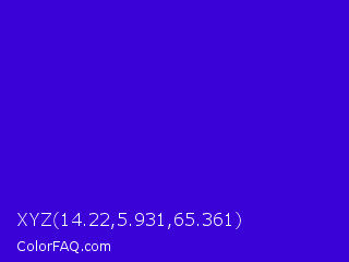XYZ 14.22,5.931,65.361 Color is a normal indigo color and the nearest color is Interdimensional Blue #360ccc. Hex code #3b02d8 and RGB value is rgb(59,2,216). In RGB color space, this color is composed of 23% red, 1% green, 85% blue, In CMYK color space, this color is composed of 73% cyan, 99% magenta, 0% yellow , 15% black , In HSL color space, this color has a hue angle of 256° , 98% saturation and 43% lightness.