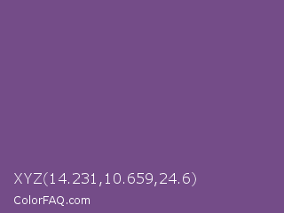 XYZ 14.231,10.659,24.6 Color is a normal purple color and the nearest color is Affair #714693. Hex code #744c88 and RGB value is rgb(116,76,136). In RGB color space, this color is composed of 45% red, 30% green, 53% blue, In CMYK color space, this color is composed of 15% cyan, 44% magenta, 0% yellow , 47% black , In HSL color space, this color has a hue angle of 280° , 28% saturation and 42% lightness.