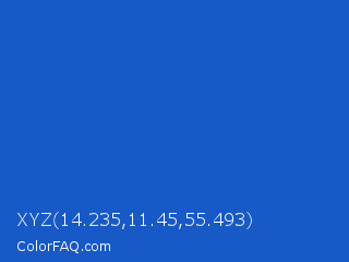 XYZ 14.235,11.45,55.493 Color is a normal blue color and the nearest color is Denim #1560bd. Hex code #1759c7 and RGB value is rgb(23,89,199). In RGB color space, this color is composed of 9% red, 35% green, 78% blue, In CMYK color space, this color is composed of 88% cyan, 55% magenta, 0% yellow , 22% black , In HSL color space, this color has a hue angle of 218° , 79% saturation and 44% lightness.