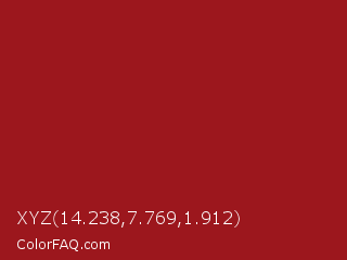 XYZ 14.238,7.769,1.912 Color is a normal red color and the nearest color is Ruby Red #9b111e. Hex code #9c171d and RGB value is rgb(156,23,29). In RGB color space, this color is composed of 61% red, 9% green, 11% blue, In CMYK color space, this color is composed of 0% cyan, 85% magenta, 81% yellow , 39% black , In HSL color space, this color has a hue angle of 357° , 74% saturation and 35% lightness.