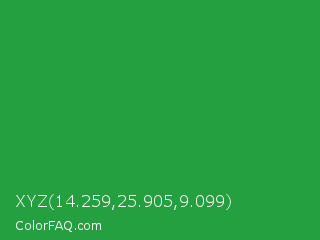 XYZ 14.259,25.905,9.099 Color is a normal green color and the nearest color is Wageningen Green #34b233. Hex code #25a040 and RGB value is rgb(37,160,64). In RGB color space, this color is composed of 15% red, 63% green, 25% blue, In CMYK color space, this color is composed of 77% cyan, 0% magenta, 60% yellow , 37% black , In HSL color space, this color has a hue angle of 133° , 62% saturation and 39% lightness.