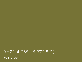 XYZ 14.268,16.379,5.9 Color is a normal yellow color and the nearest color is Pesto #7c7631. Hex code #767336 and RGB value is rgb(118,115,54). In RGB color space, this color is composed of 46% red, 45% green, 21% blue, In CMYK color space, this color is composed of 0% cyan, 3% magenta, 54% yellow , 54% black , In HSL color space, this color has a hue angle of 57° , 37% saturation and 34% lightness.
