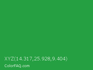 XYZ 14.317,25.928,9.404 Color is a normal green color and the nearest color is Wageningen Green #34b233. Hex code #25a042 and RGB value is rgb(37,160,66). In RGB color space, this color is composed of 15% red, 63% green, 26% blue, In CMYK color space, this color is composed of 77% cyan, 0% magenta, 59% yellow , 37% black , In HSL color space, this color has a hue angle of 134° , 62% saturation and 39% lightness.