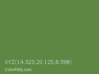 XYZ 14.323,20.125,8.598 Color is a normal green color and the nearest color is Hippie Green #53824b. Hex code #5e8744 and RGB value is rgb(94,135,68). In RGB color space, this color is composed of 37% red, 53% green, 27% blue, In CMYK color space, this color is composed of 30% cyan, 0% magenta, 50% yellow , 47% black , In HSL color space, this color has a hue angle of 97° , 33% saturation and 40% lightness.