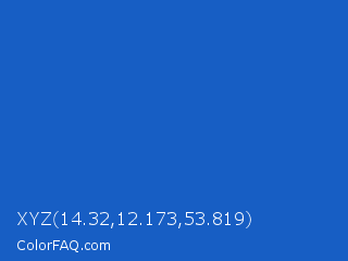XYZ 14.32,12.173,53.819 Color is a normal blue color and the nearest color is Denim #1560bd. Hex code #175ec4 and RGB value is rgb(23,94,196). In RGB color space, this color is composed of 9% red, 37% green, 77% blue, In CMYK color space, this color is composed of 88% cyan, 52% magenta, 0% yellow , 23% black , In HSL color space, this color has a hue angle of 215° , 79% saturation and 43% lightness.