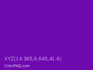 XYZ 14.365,6.645,41.6 Color is a normal purple color and the nearest color is Violet RYB #8601af. Hex code #6e09b0 and RGB value is rgb(110,9,176). In RGB color space, this color is composed of 43% red, 4% green, 69% blue, In CMYK color space, this color is composed of 38% cyan, 95% magenta, 0% yellow , 31% black , In HSL color space, this color has a hue angle of 276° , 90% saturation and 36% lightness.