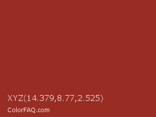 XYZ 14.379,8.77,2.525 Color is a normal red color and the nearest color is Vivid Auburn #922724. Hex code #992d23 and RGB value is rgb(153,45,35). In RGB color space, this color is composed of 60% red, 18% green, 14% blue, In CMYK color space, this color is composed of 0% cyan, 71% magenta, 77% yellow , 40% black , In HSL color space, this color has a hue angle of 5° , 63% saturation and 37% lightness.