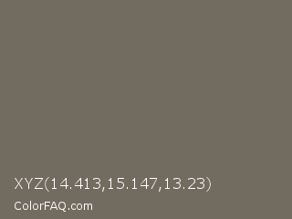 XYZ 14.413,15.147,13.23 Color is a normal orange color and the nearest color is Flint #6f6a61. Hex code #726c60 and RGB value is rgb(114,108,96). In RGB color space, this color is composed of 45% red, 42% green, 38% blue, In CMYK color space, this color is composed of 0% cyan, 5% magenta, 16% yellow , 55% black , In HSL color space, this color has a hue angle of 40° , 9% saturation and 41% lightness.