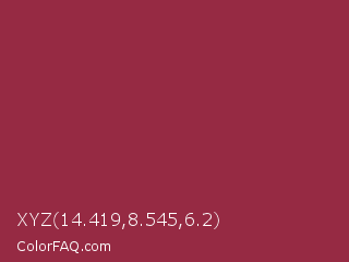 XYZ 14.419,8.545,6.2 Color is a normal red color and the nearest color is Big Dip O Ruby #9c2542. Hex code #962a43 and RGB value is rgb(150,42,67). In RGB color space, this color is composed of 59% red, 16% green, 26% blue, In CMYK color space, this color is composed of 0% cyan, 72% magenta, 55% yellow , 41% black , In HSL color space, this color has a hue angle of 346° , 56% saturation and 38% lightness.